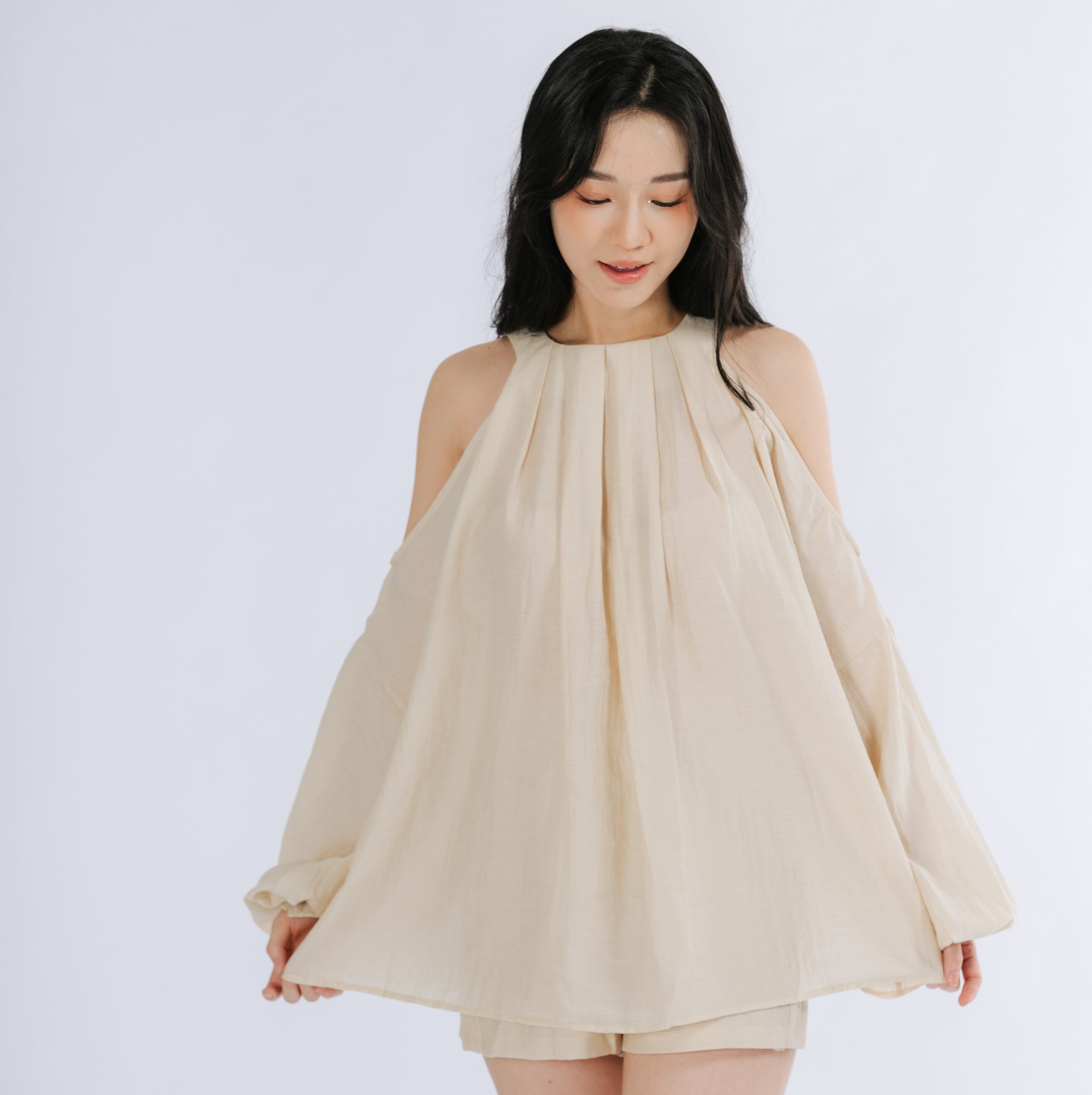 This adorable set features a round neck top with chic cut-out shoulders, adding a playful twist to the design. The matching bottoms complete the look, making it a perfect outfit for any casual outing. Stylish and cute, this set is ideal for embracing a fun, feminine vibe.