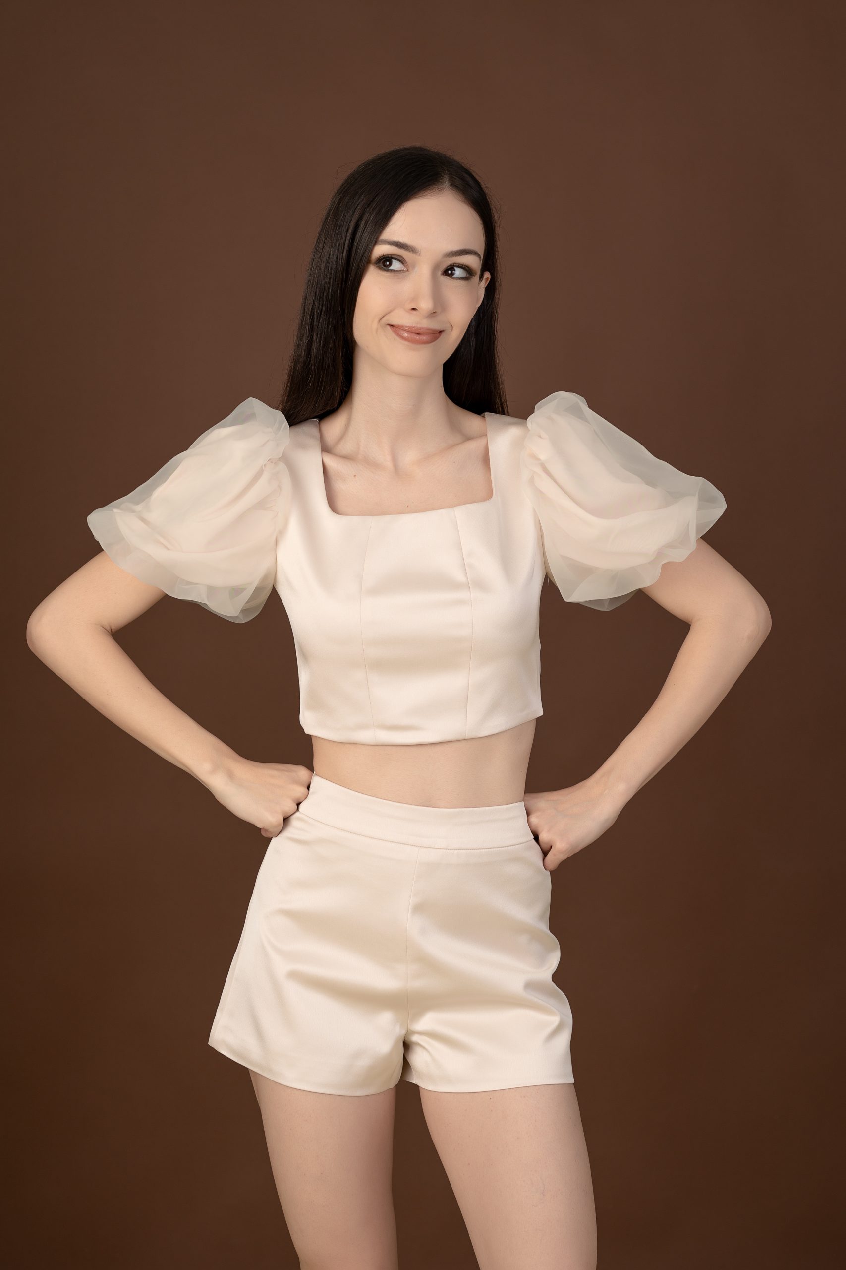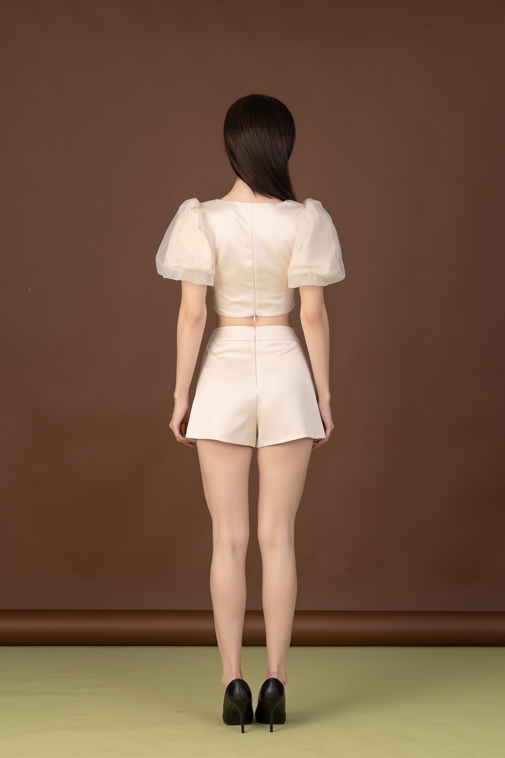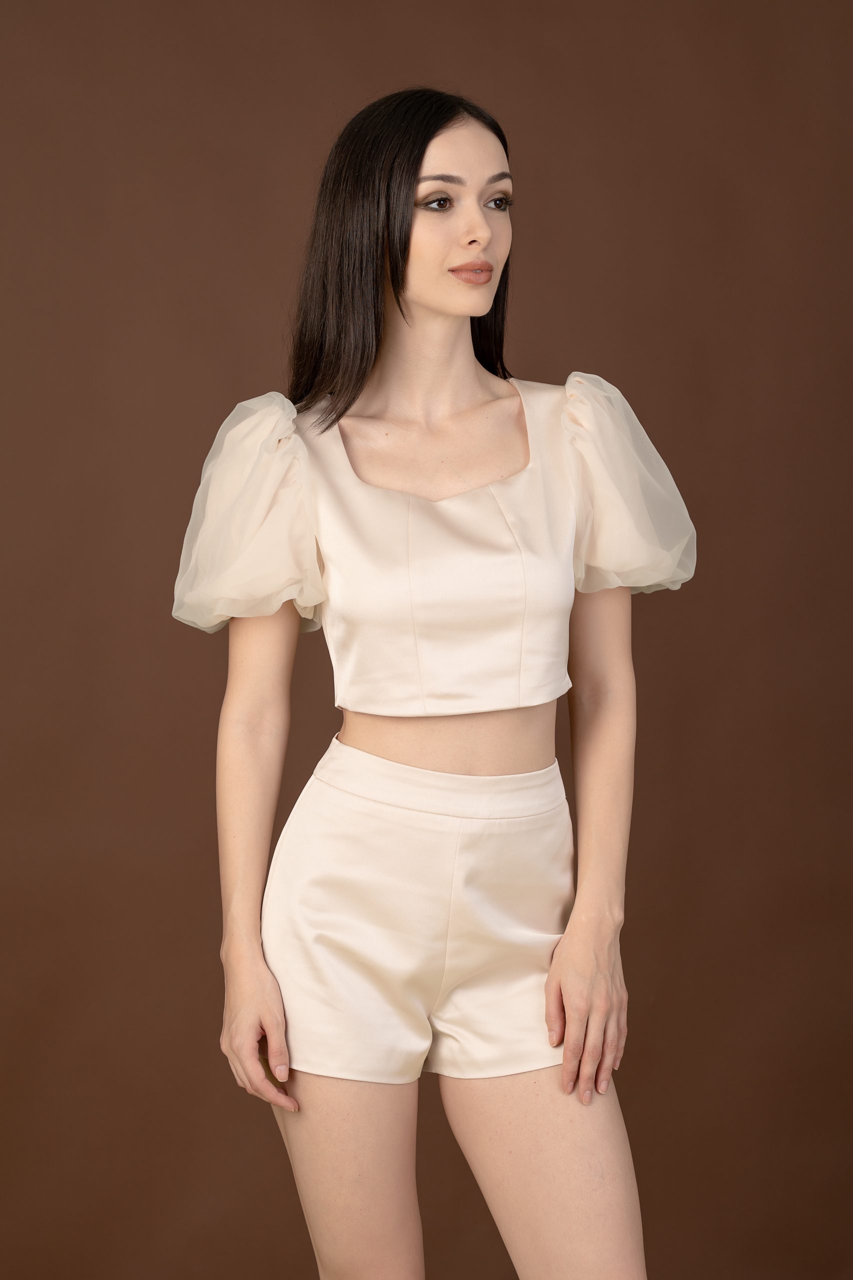 A champagne acetate slim high-waisted shorts in champagne, blending drama and elegance, offering a flattering, sophisticated look suitable for various social events.